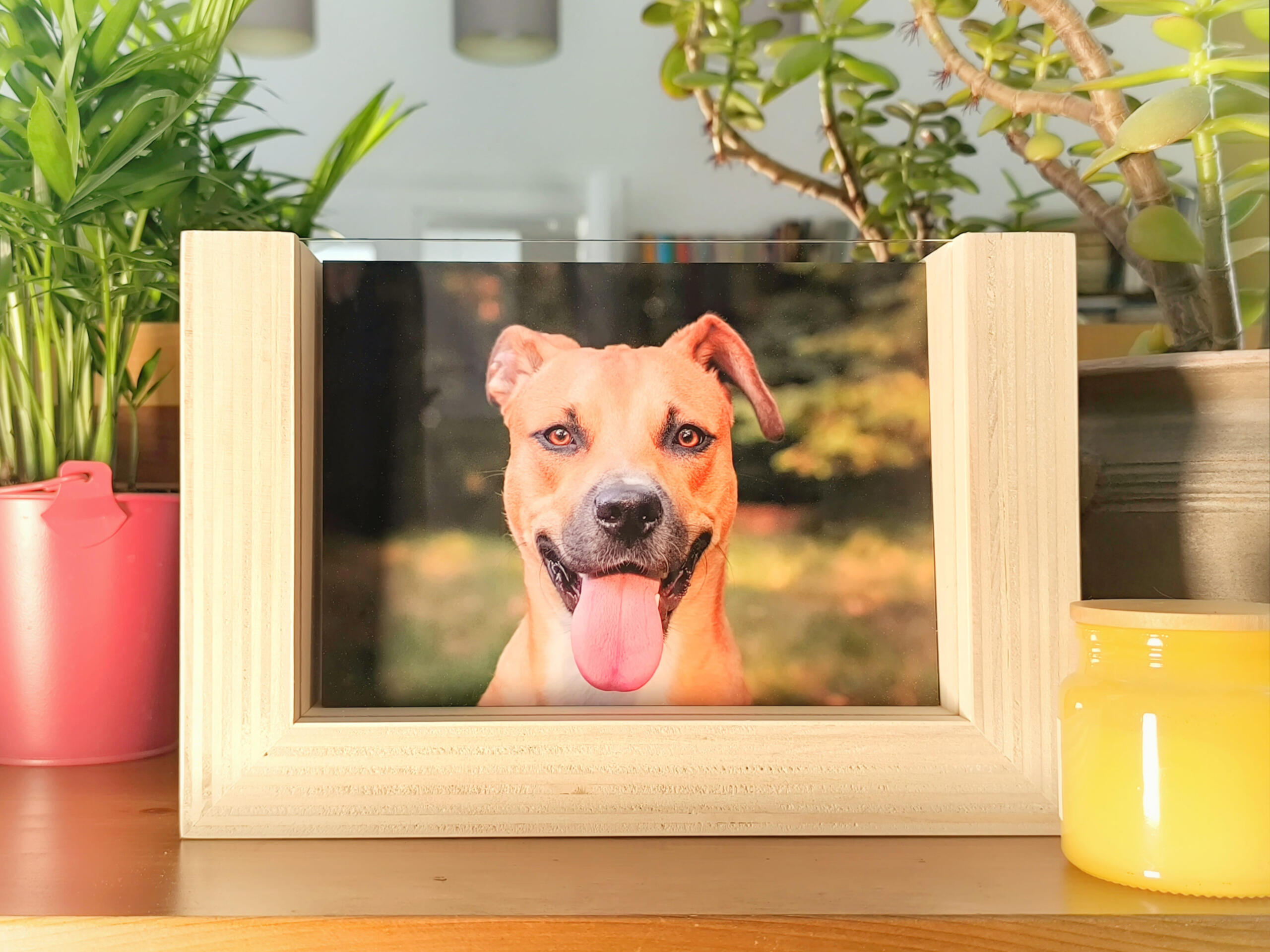 egy asztalra/polcra állítható elegáns fakeret, amiben a fotókártyákat tarthatod